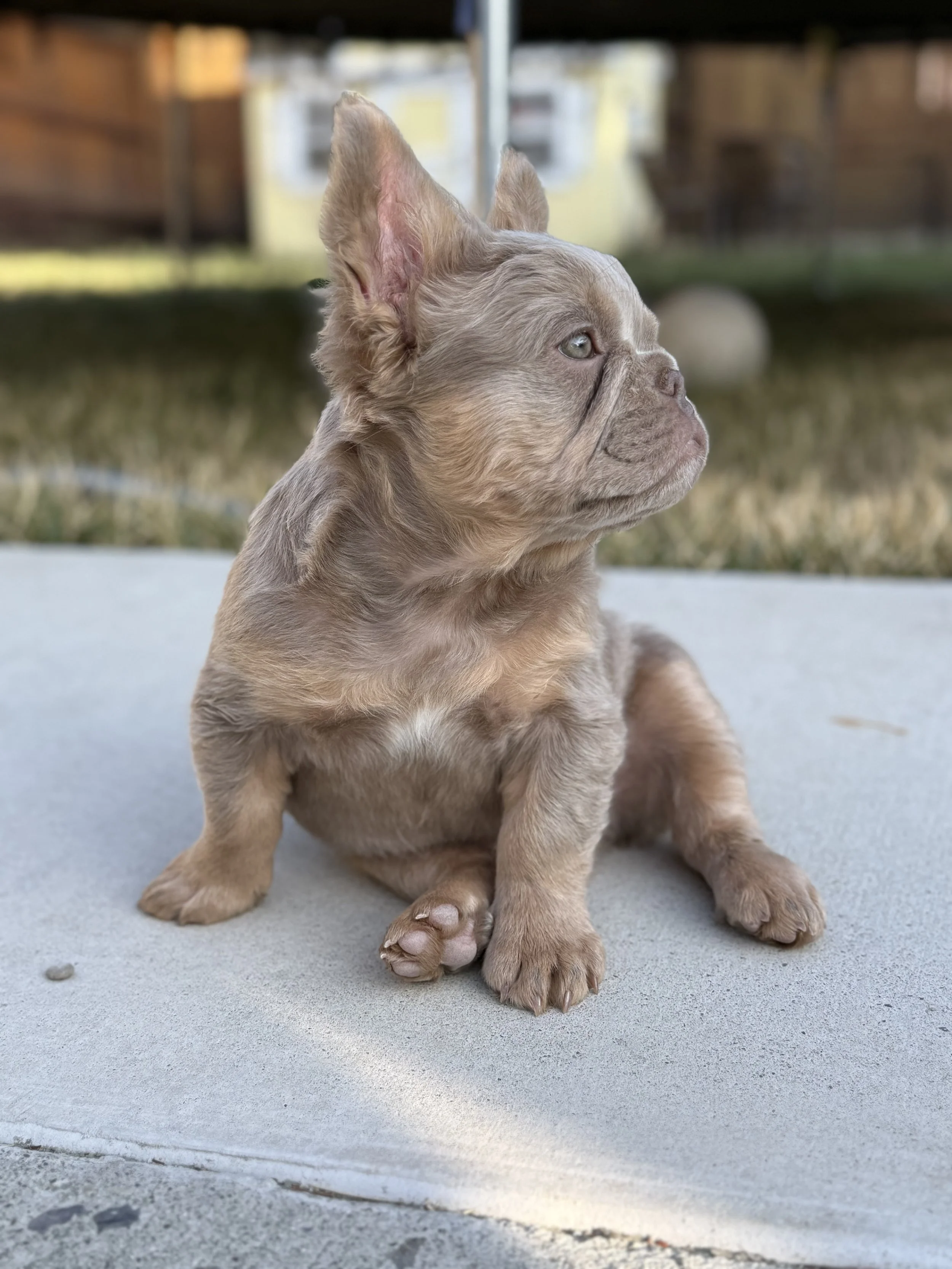 Enzo has that perfect little smashed in frenchie face. He has a Prince Charming like attitude with intent gaze that makes any heart melt. An extremely short back with beautiful tan points and an incredible fluffy classy coat. He is an Isabella and Tan two-toned fluffy. He can produce compact beautiful New shade Isabella’s.