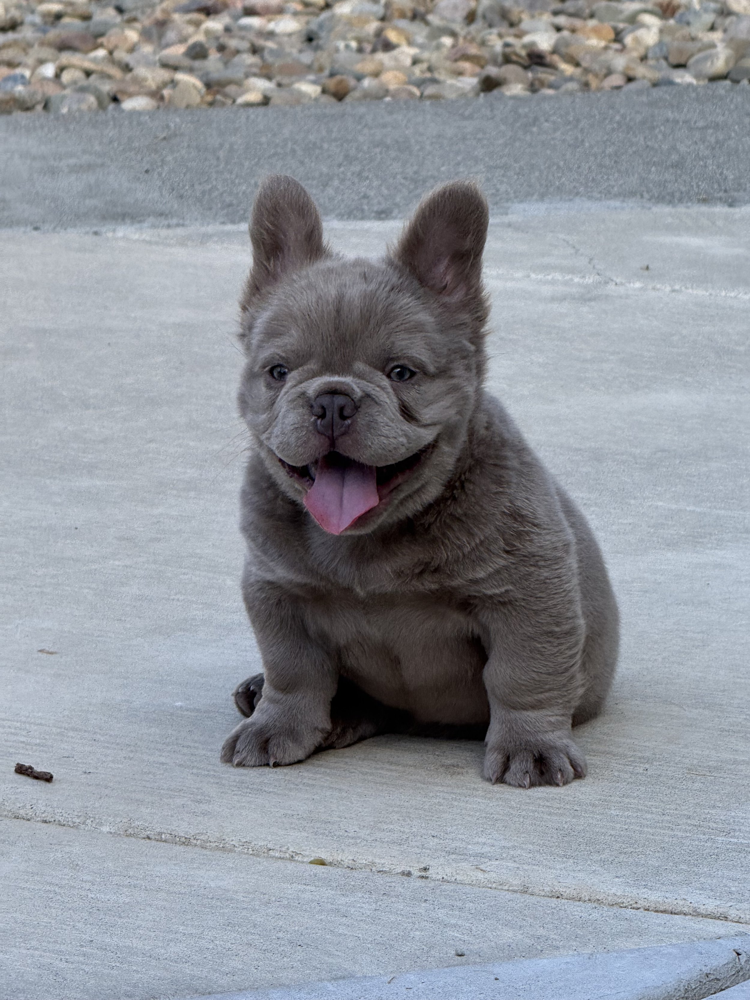 Sophie is our very first Frenchie. She is a full fluffy Blue Trindle that carries Rojo. Her father is Grizzly, the world famous Isabella full-fluffy French Bulldog from @topofthelinefrenchiesllc. This girl is very compact with a very nice head and wide shoulders. When she’s not sun-bathing, you can catch her drinking a whole bowl of water in one sitting or cuddling on the couch with one of our kids. She has an amazing temperament and loves to follow me around the house.